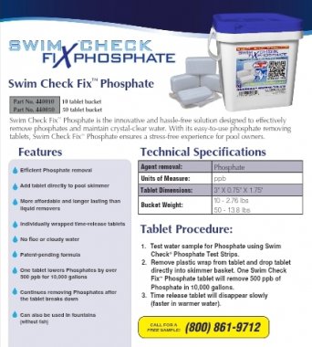 Swim Check Fix™ Phosphate is the smarter, cleaner, and safer way to reduce phosphates and maintain crystal-clear pool water. Our innovative time-release tablets offer a hassle-free alternative to messy liquid products and flocculants. Simply drop a